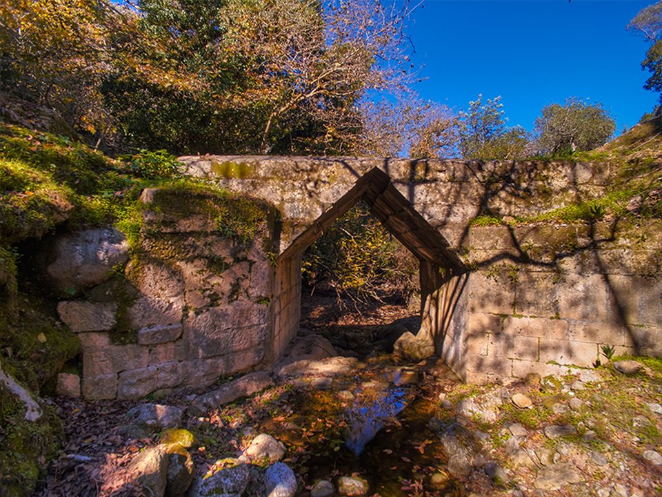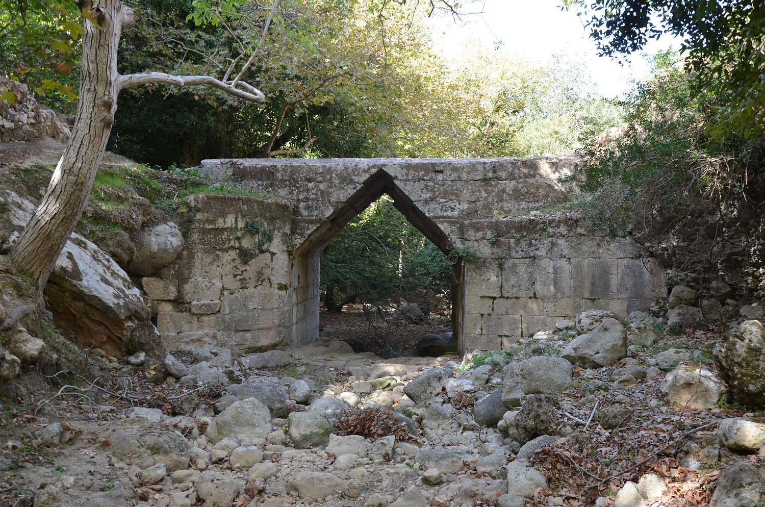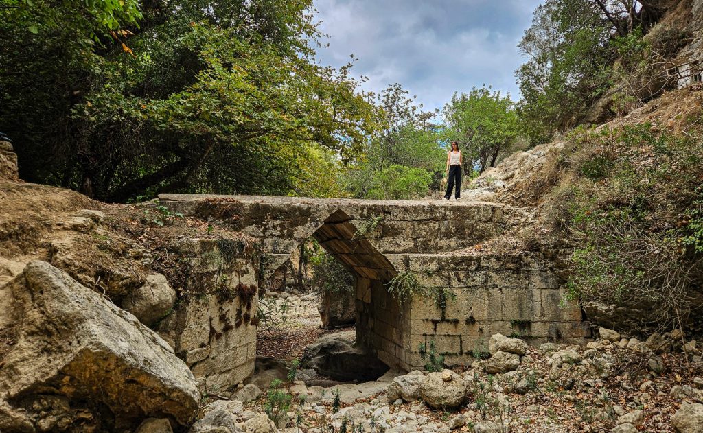 The well-preserved structure spans a single 3.95 m opening, which is unusually large for a false arch. The opening is cut from unmortared limestone blocks in the shape of an isosceles triangle, with a height of 1.84 m. The overall length of the bridge is 9.35 m. Its width varies from 5.1 to 5.2 m, slightly narrowing toward the center above the arch (5.05 m at the midpoint). The height ranges from 4 to 4.2 m. The bridge, still in use, was first described by the English traveler T. A. B. Spratt in his Travels and Researches in Crete, after his visit to the site in 1853. At that time, another ancient bridge with a triangular arch stood a few hundred meters away, but a later report suggests it was destroyed sometime before 1893.