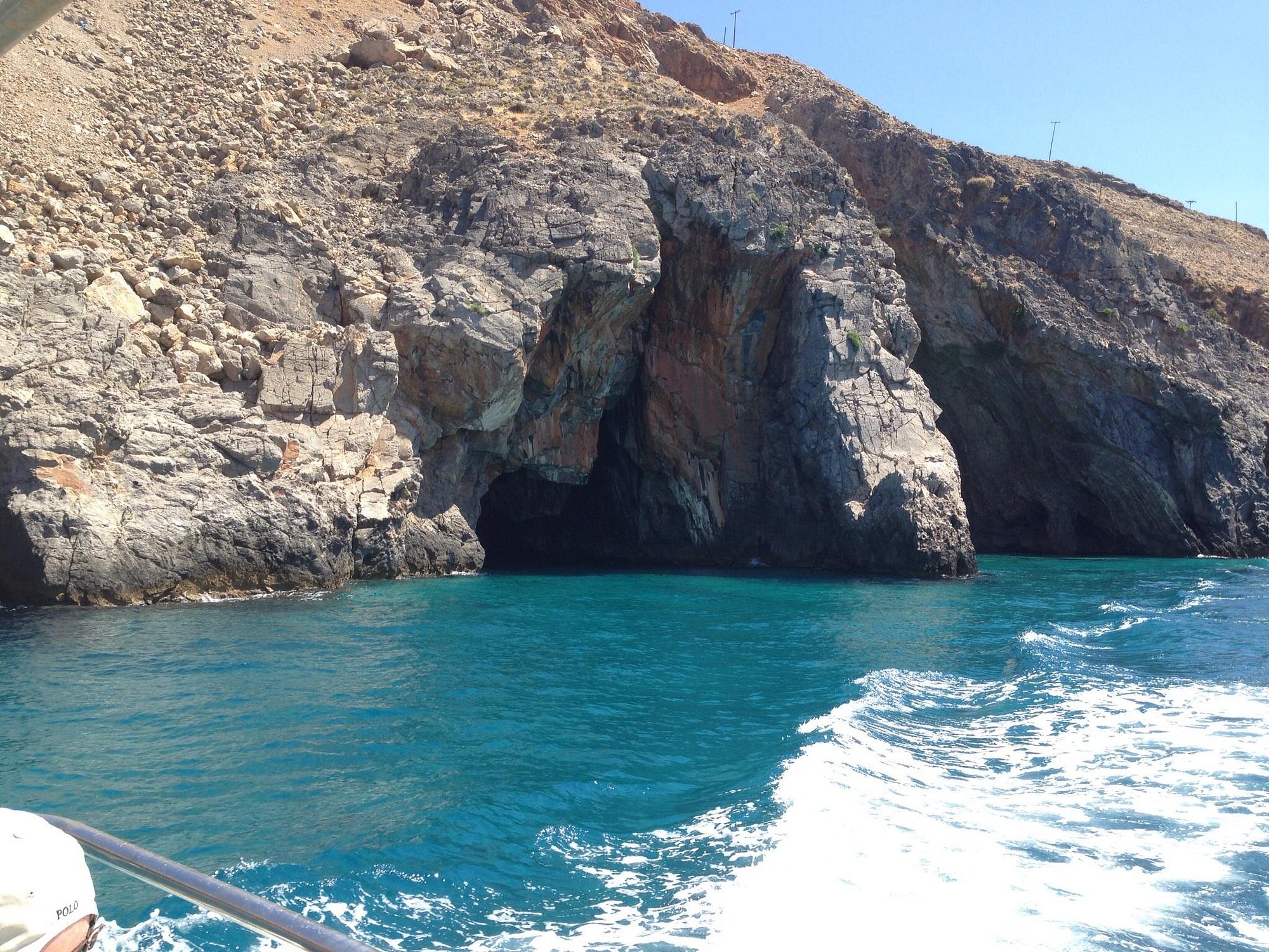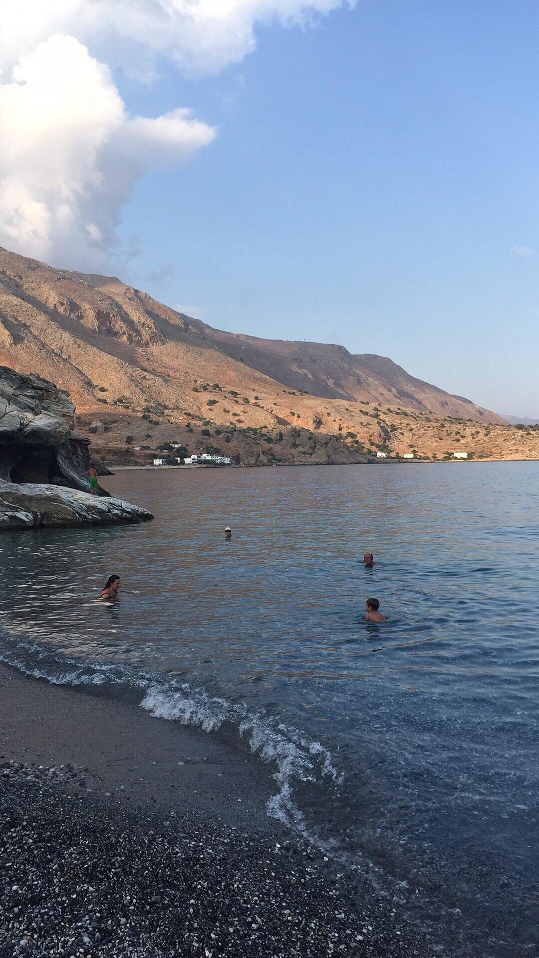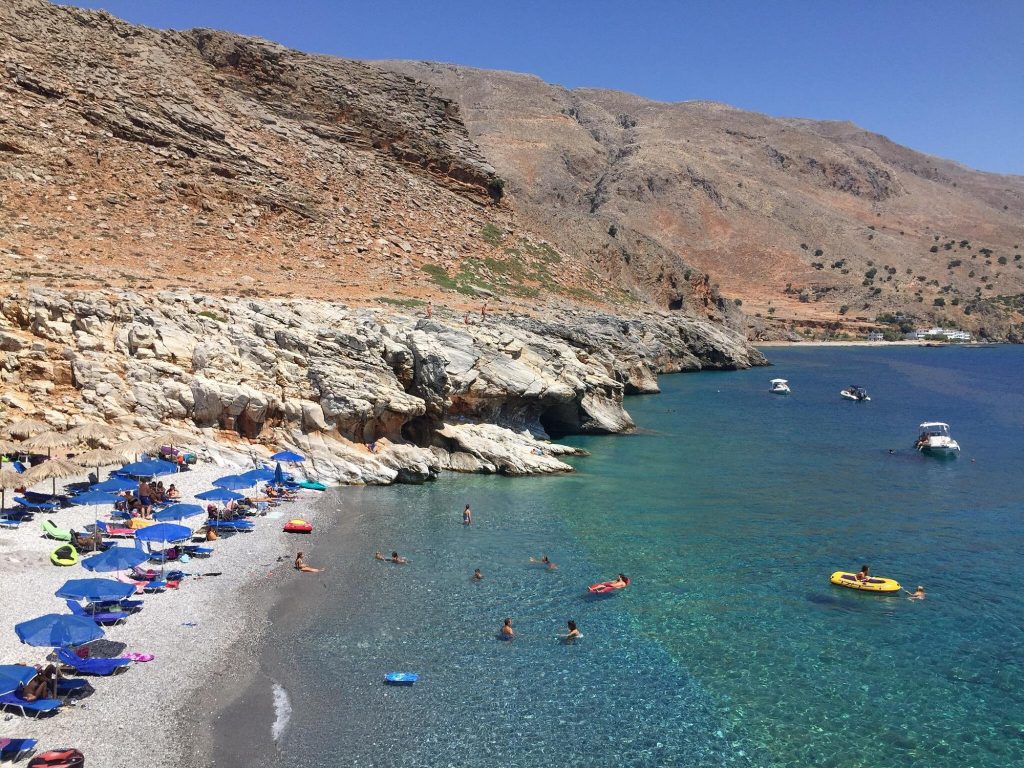 The beach which is right at the exit of Aradaina gorge, has small dark pebbles and crystal blues waters. It is surrounded by white impressive rocks that shape many caves that the visitors can explore while swimming.