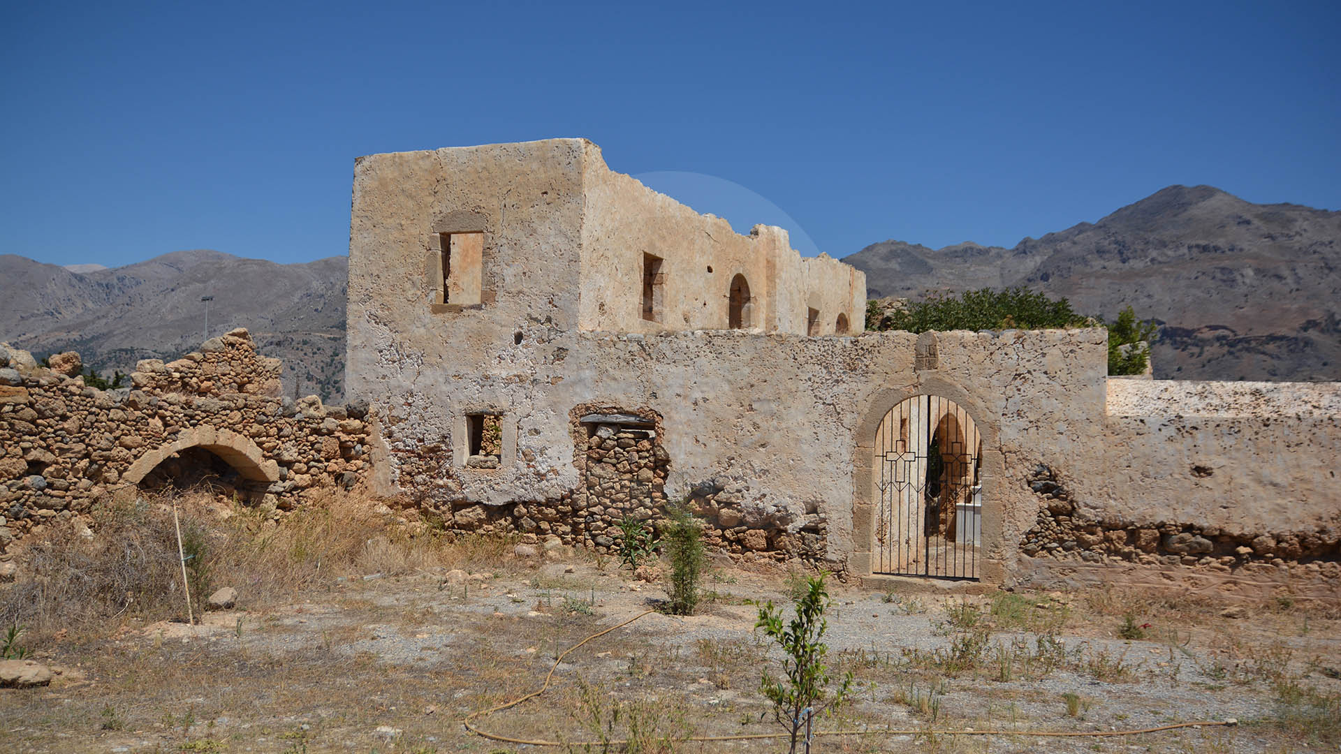 The church of Agios Charalampos is located a few meters south of the church of Agios Nikitas at Frangokastello. The church seems to exist before 1821, but that was the time that monk Grigorios and nun Magdalini moved in and rebuilt the church but also expanded it to a monastery. The monastery is surrounded by a crenelated wall, while on its west side is located a two leveled building that used to be the monks’ resident. This building is a great example of the local architecture of that period.