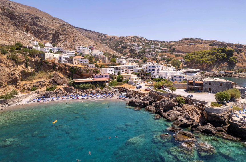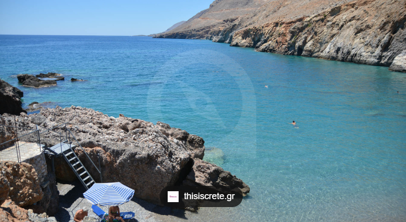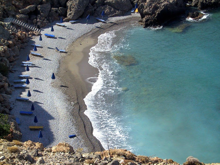 Vrissi beach (i.e. the spring), is located at the west end of Chora Sfakio, 75km south of Chania town. Umbrellas and sunbeds, showers, restaurant, fish taverns, accommodation. Vrissi beach features fresh water that tries down the mountains and is therefore redemptive on hot days