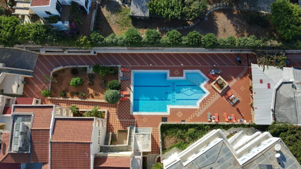 Guests enjoy an infinity swimming pool, sun terrace, and lush garden. The property includes a bar, pool bar, coffee shop, and outdoor seating area. Free WiFi is available throughout the aparthotel.